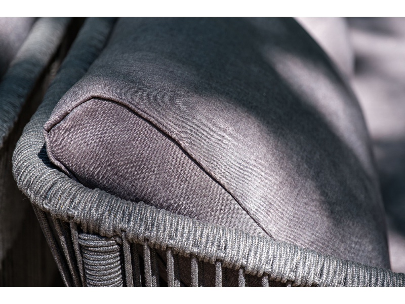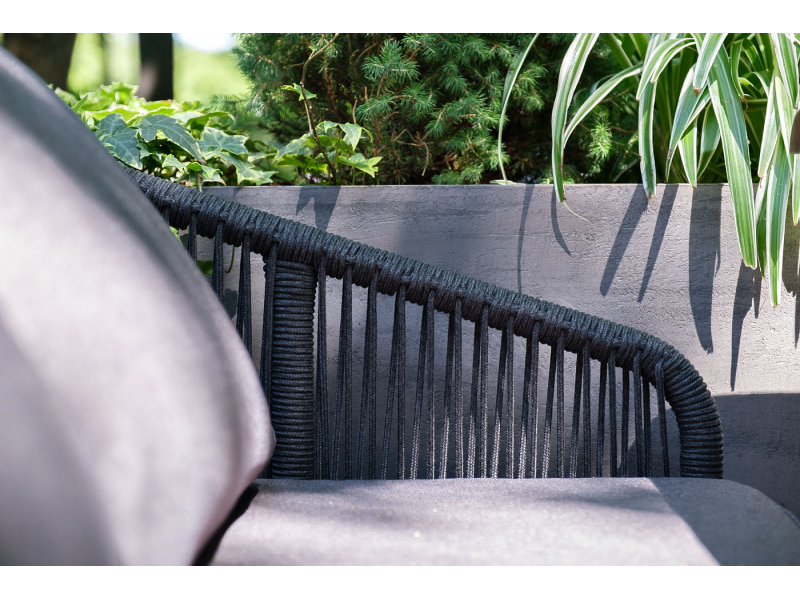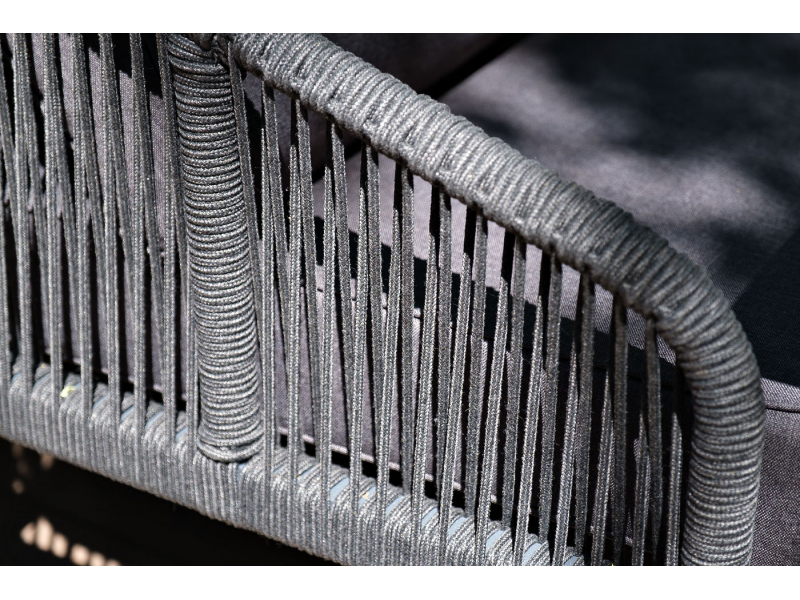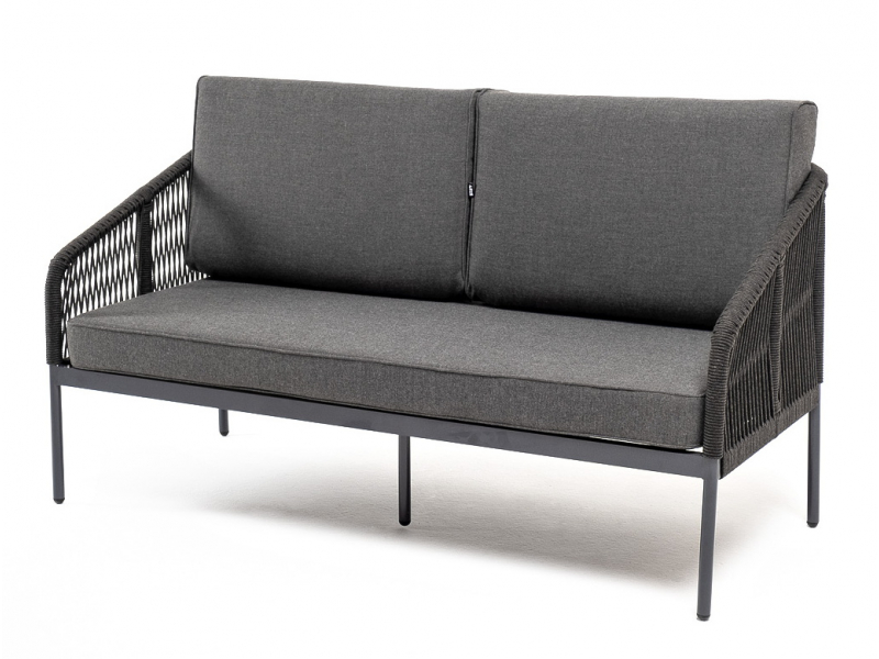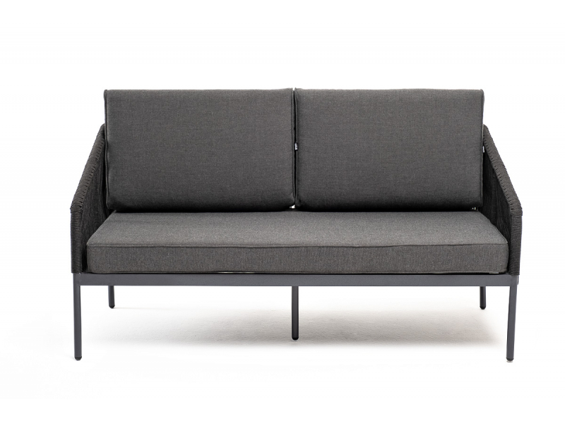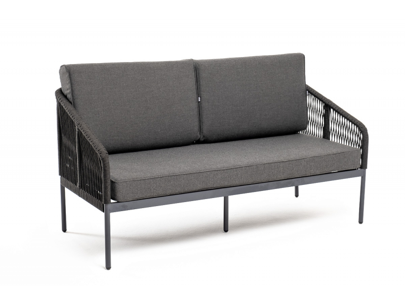 Описание "Канны" диван 2-местный плетеный из роупа, каркас алюминий темно-серый (RAL7024) муар, роуп темно-серый круглый, ткань темно-серая 027