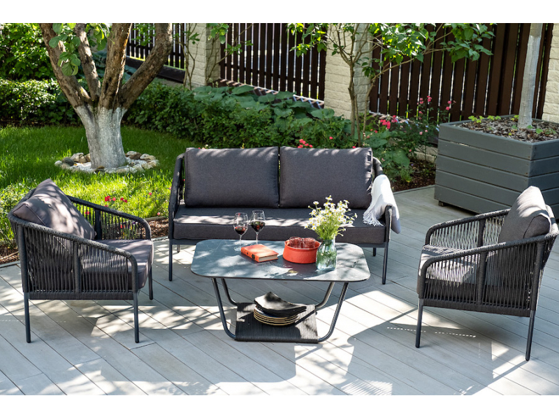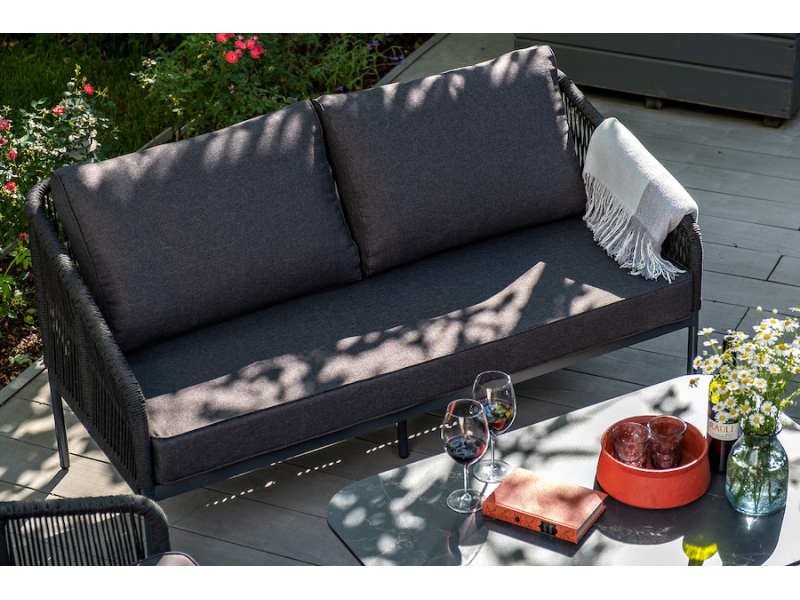 Двухместный плетеный диван «Канны» - это стильный и удобный элемент для отдыха на открытом воздухе или в помещении. Он изготовлен из качественного и прочного материала - роупа темно-серого цвета, обеспечивающий высокую стойкость к износу и долговечность изделия.