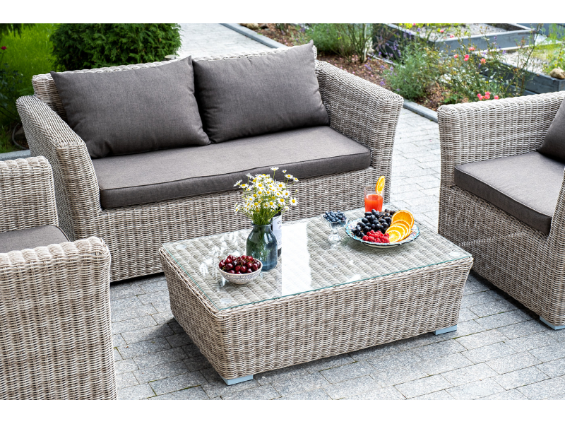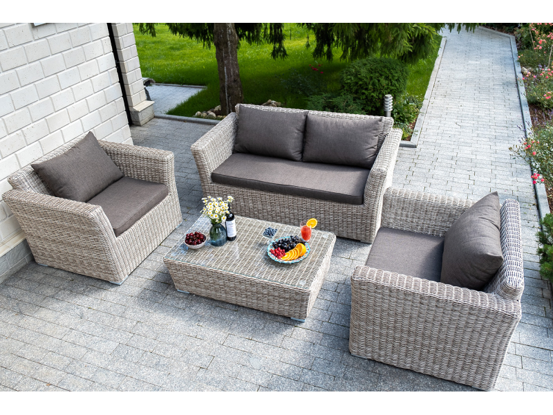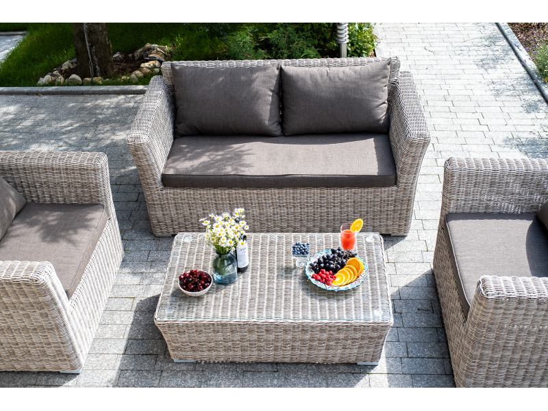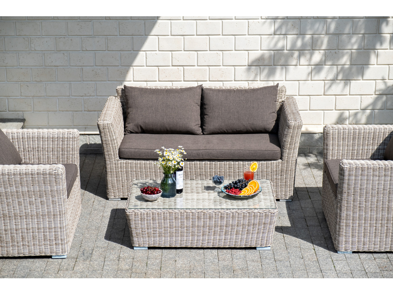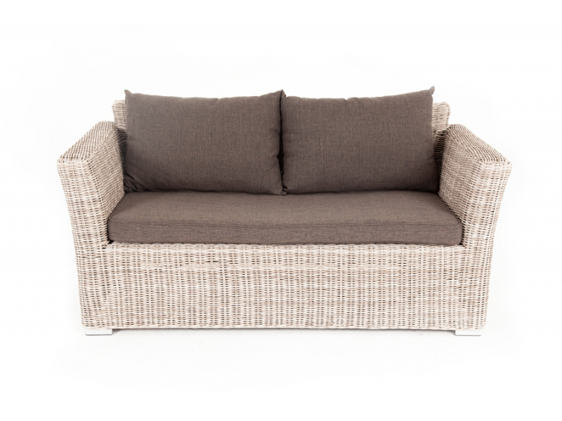 Диван «Капучино» подходит для удобного размещения двух персон. Он имеет алюминиевый каркас, который выдерживает высокие нагрузки. Размер модели – 1700×865×815 мм. Диван выполнен из искусственного ротанга натурального бежевого цвета с помощью ручного круглого плетения. Укомплектован двухместный диван подушками со съёмными чехлами. Они пошиты из прочного полиэстера. Материал обеспечивает защиту текстильным изделиям, которая усиливается за счет влагоотталкивающей пропитки ткани.