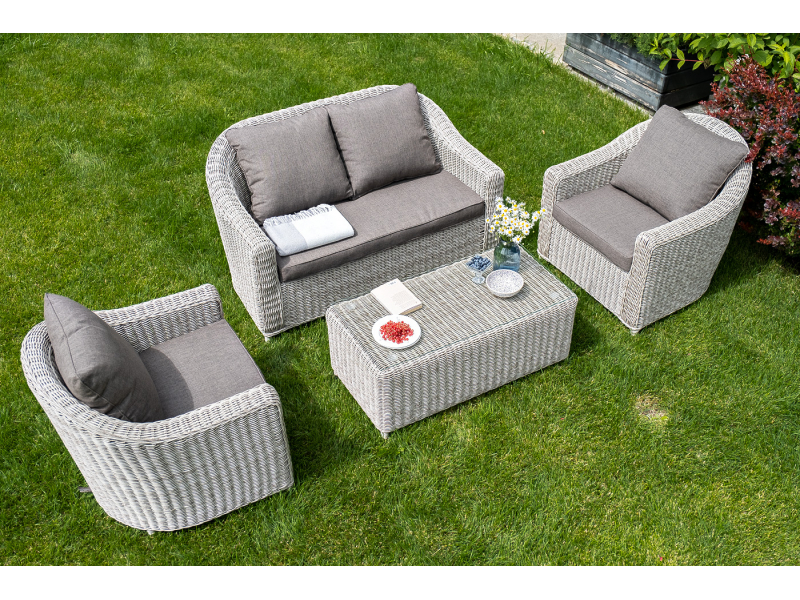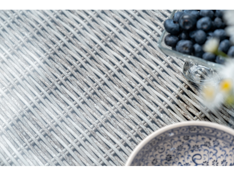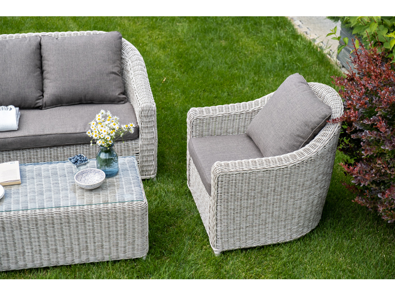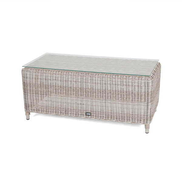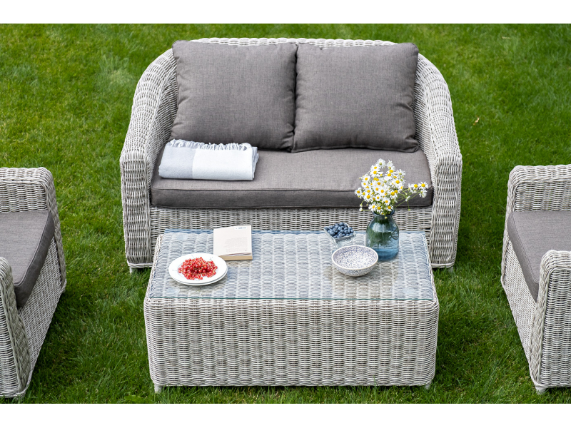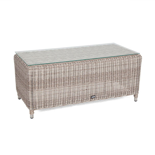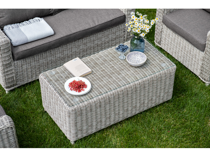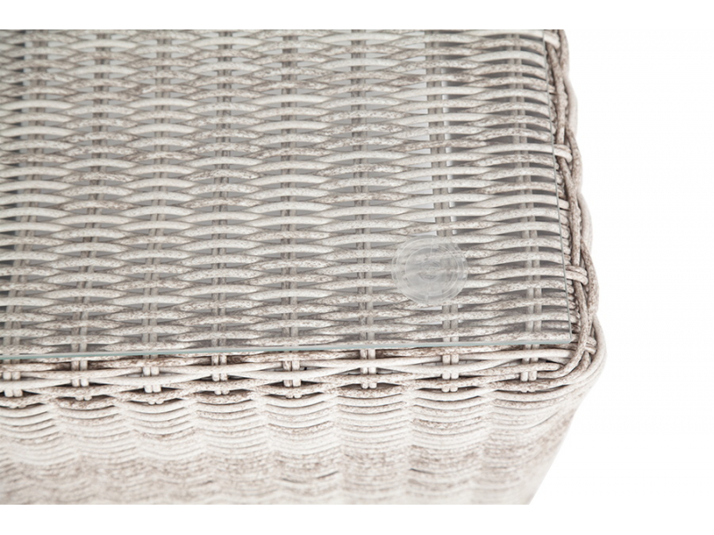 Журнальный столик «Кон Панна» изготовлен из алюминиевого каркаса, вручную оплетенного круглым искусственным ротангом бежевого оттенка.
