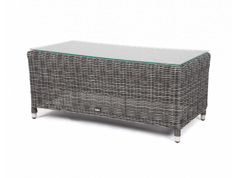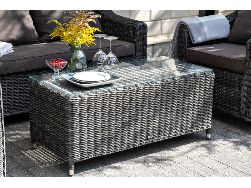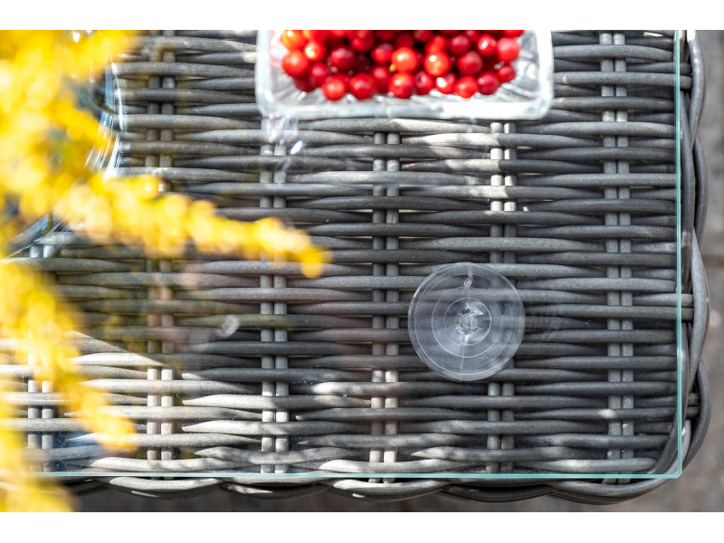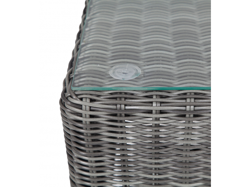 В основе мебели находится алюминиевый каркас высокой прочности. Декоративной составляющей является ручная круглая оплетка, которая выполнена из искусственного ротанга. Столик представлен в цвете "графит".