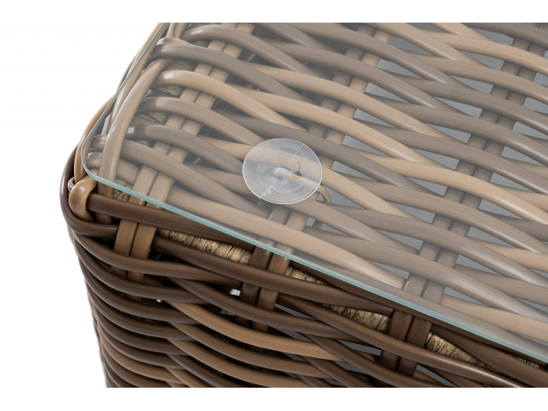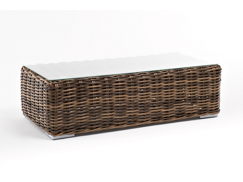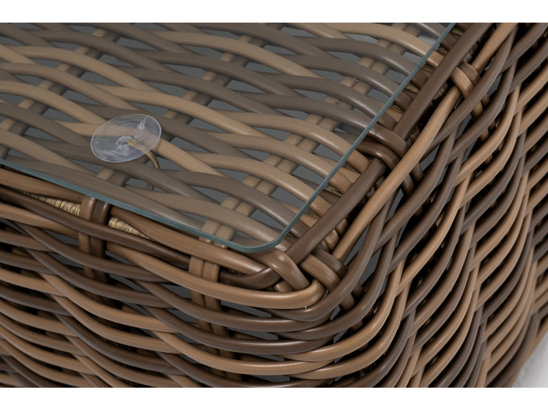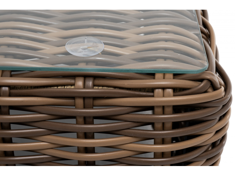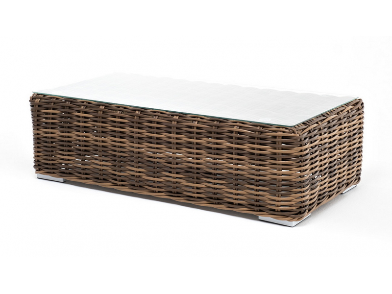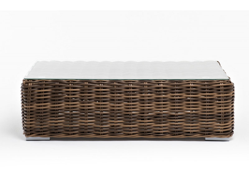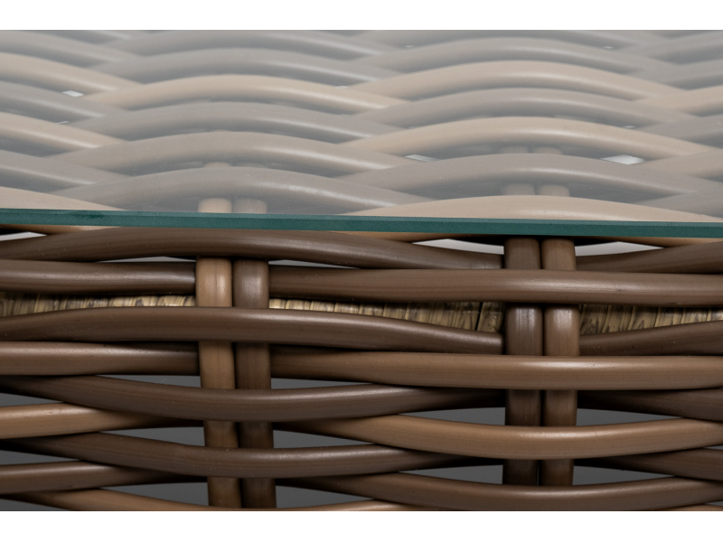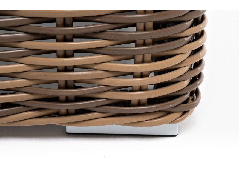 Каркас столика изготовлен из алюминия, вручную оплетенного круглым искусственным ротангом.