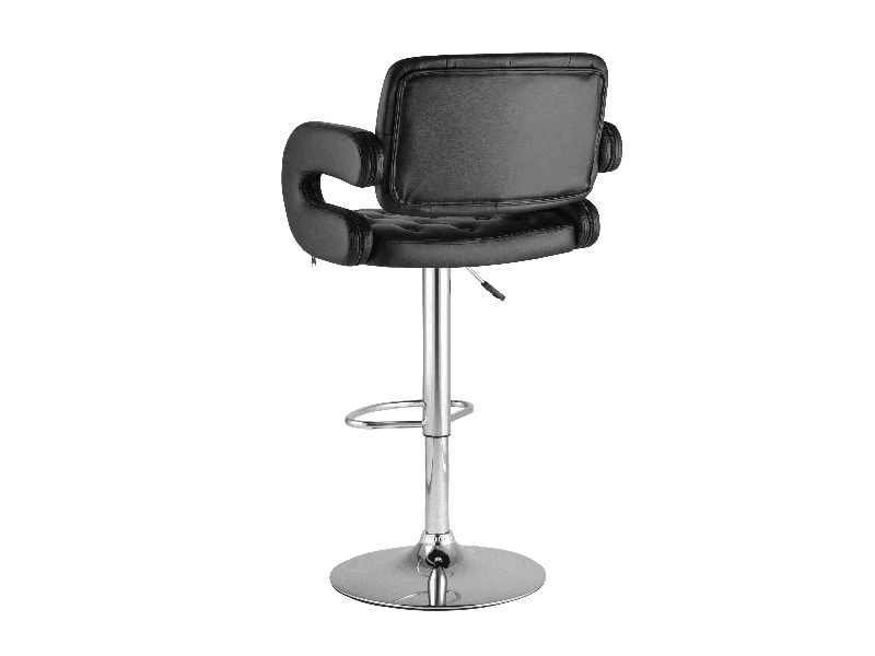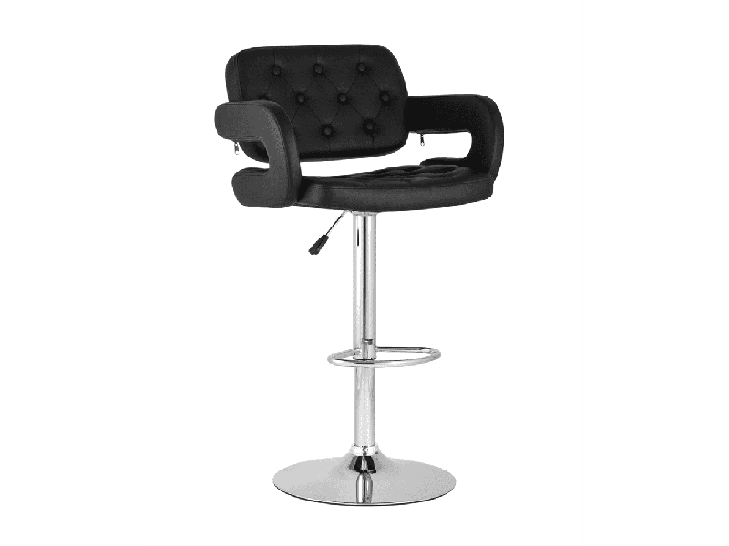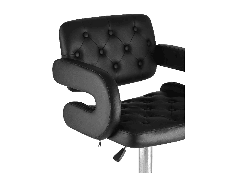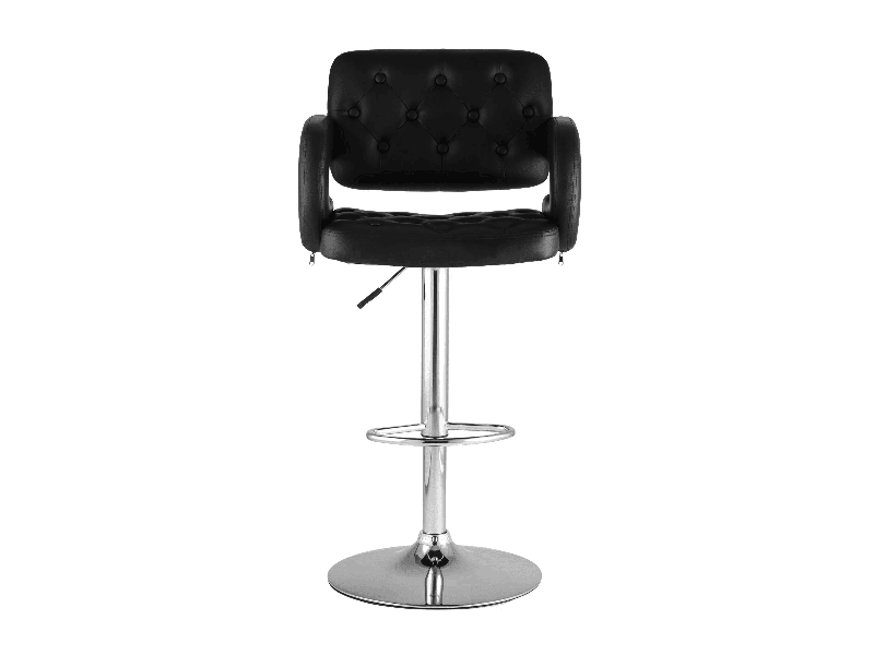 Для обивки сиденья барного стула использована PU-кожа – искусственный материал с высокой прочностью, износостойкостью и естественной фактурой. Каретная стяжка в оформлении спинки сиденья и черный цвет сочетаются с металлическим блеском гладкого хромированного основания. Высота сиденья регулируется от 61 до 83 сантиметров - можно подогнать под барную стойку или столешницу любого размера.