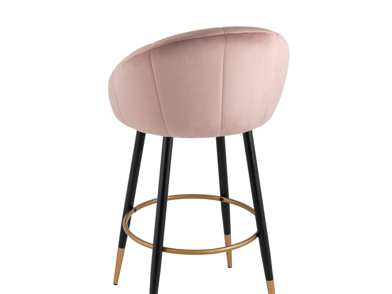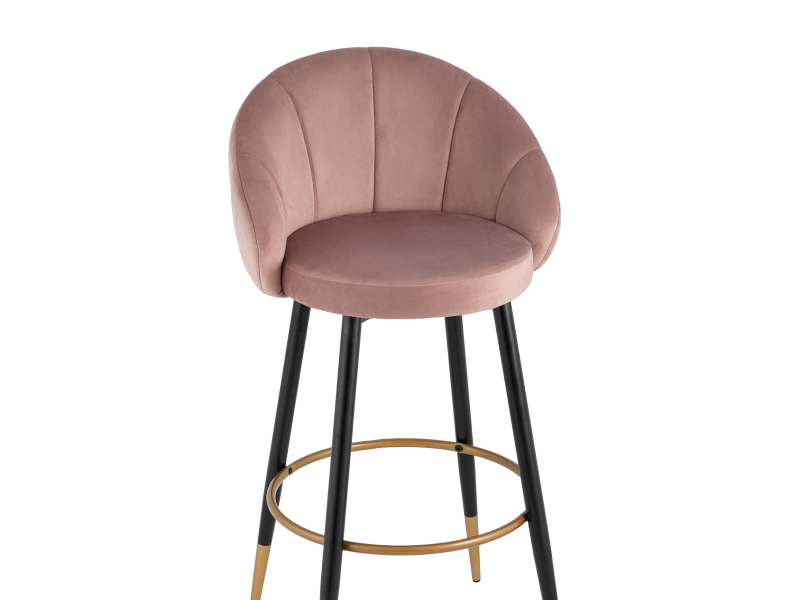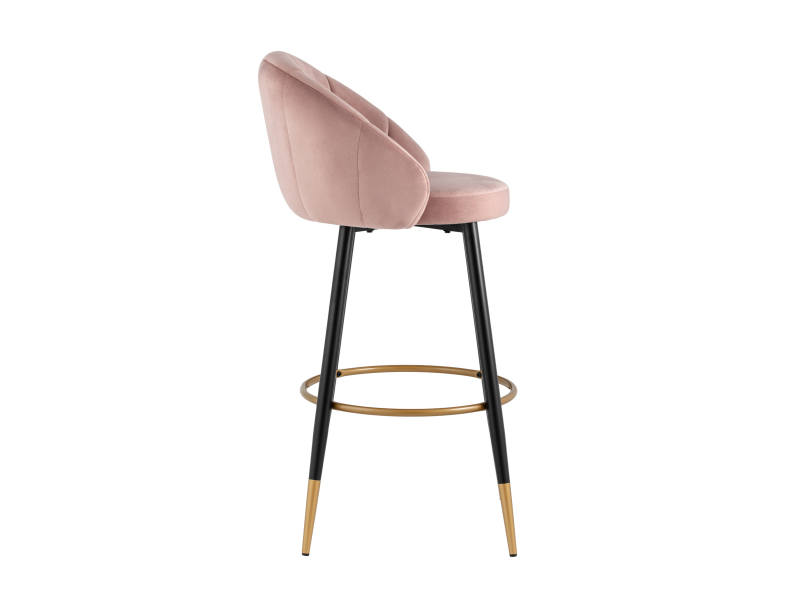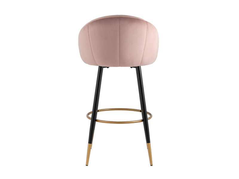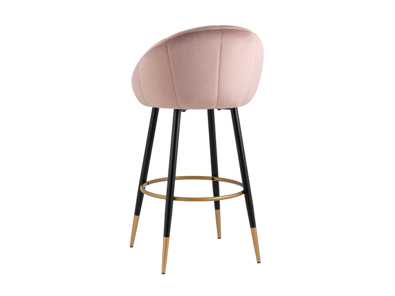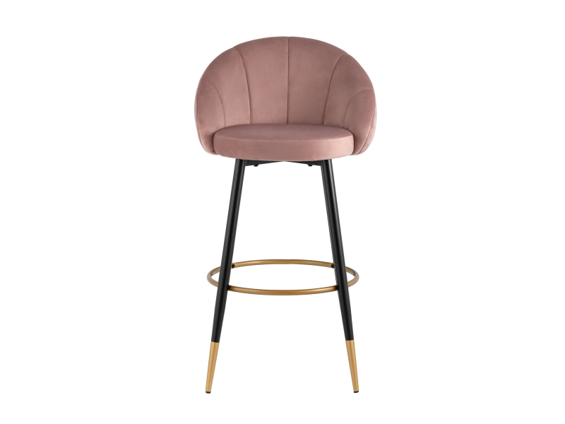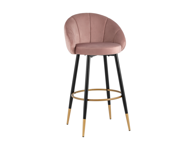 Яркий барный стул с необычной спинкой в обивке из прочного велюра. Надежная опора достигается благодаря металлическому каркасу и удобным устойчивым ножкам с золотым декором. Спинка с оригинальным дизайном украшена широкими полосами в виде веера. На ножках, для дополнительного комфорта при посадке, предусмотрена округлая подножка.
