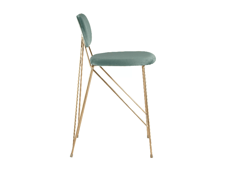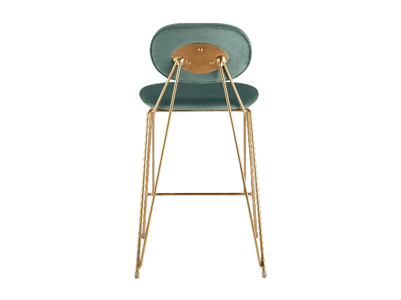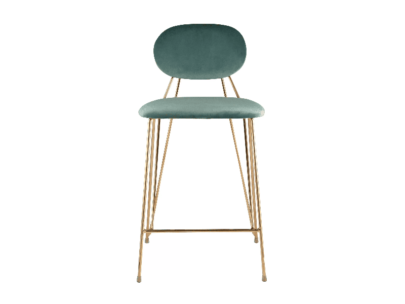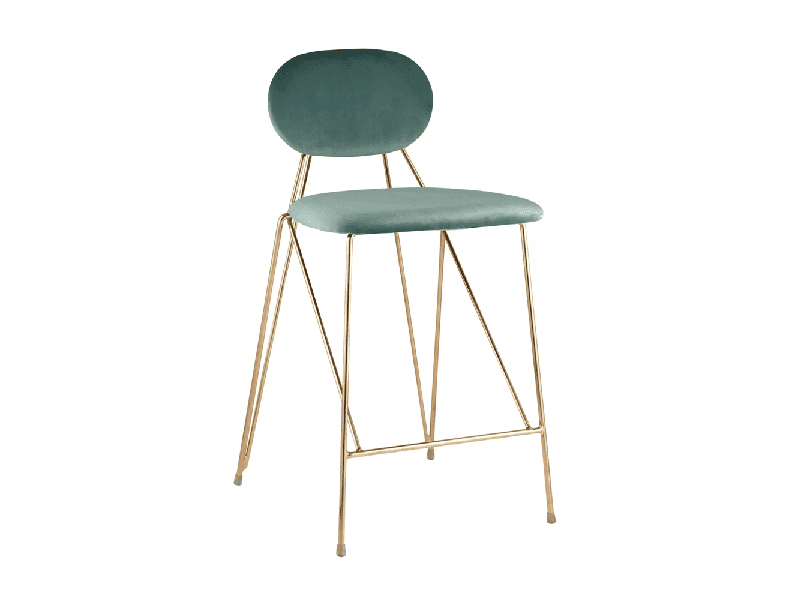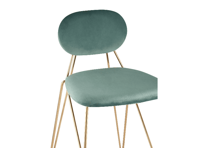 Модель с ярким дизайном и красивым сочетанием велюровой обивки и золотых изящных ножек. Стул выдерживает вес до 150 кг, не регулируется по высоте. Высота стула 92 см. Ширина сиденья в 48 сантиметров и глубина в 53 сантиметра создают комфортную посадку несмотря на отсутствие подлокотников. Для большего удобства все углы мягко закруглены и безопасны.