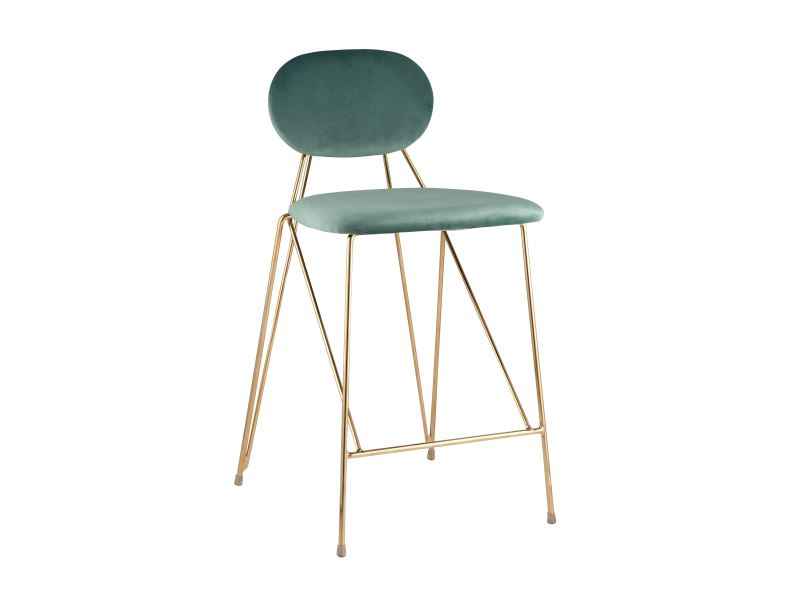 Модель с ярким дизайном и красивым сочетанием велюровой обивки и золотых изящных ножек. Стул выдерживает вес до 150 кг, не регулируется по высоте. Высота стула 92 см. Ширина сиденья в 48 сантиметров и глубина в 53 сантиметра создают комфортную посадку несмотря на отсутствие подлокотников. Для большего удобства все углы мягко закруглены и безопасны.